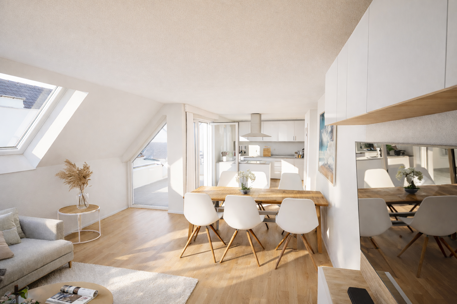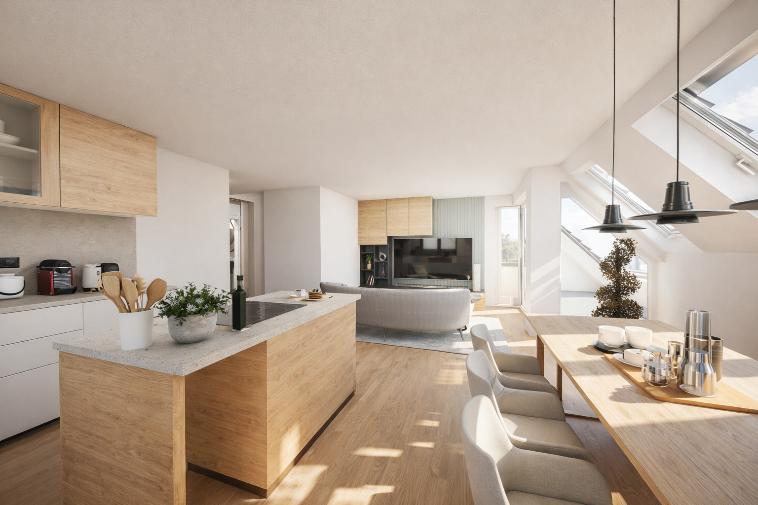 In den großen Wohnungen mit über 100 m² Wohnfläche findet die ganze Familie Platz. Helle Wohn-/Essbereiche mit traumhaften Küchen werden zum Mittelpunkt. Besondere Highlights sind unter anderem der Aufzug direkt in die Wohnung, große Fensterfronten und perfekte Grundrisse. Die beiden Maisonette-Wohnungen schaffen ein Gefühl vom eigenem Haus und Privatsphäre.