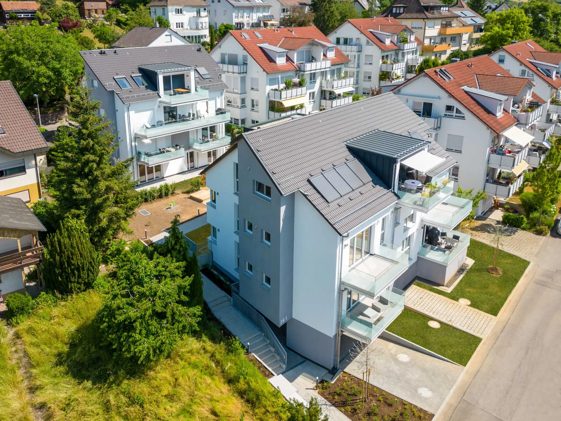 Besonders erstklassige Ausstattung, wie hochwertige Glas-Balkongeländer, viele Dachflächenfenster und ausschließlich Süd-Balkone unterstreichen die Exklusivität der Lage und des Projekts. Traumhaft eingebettet in der Schlossberg, fügt sich das Duo gelungen in die Bestandsbebauung ein.