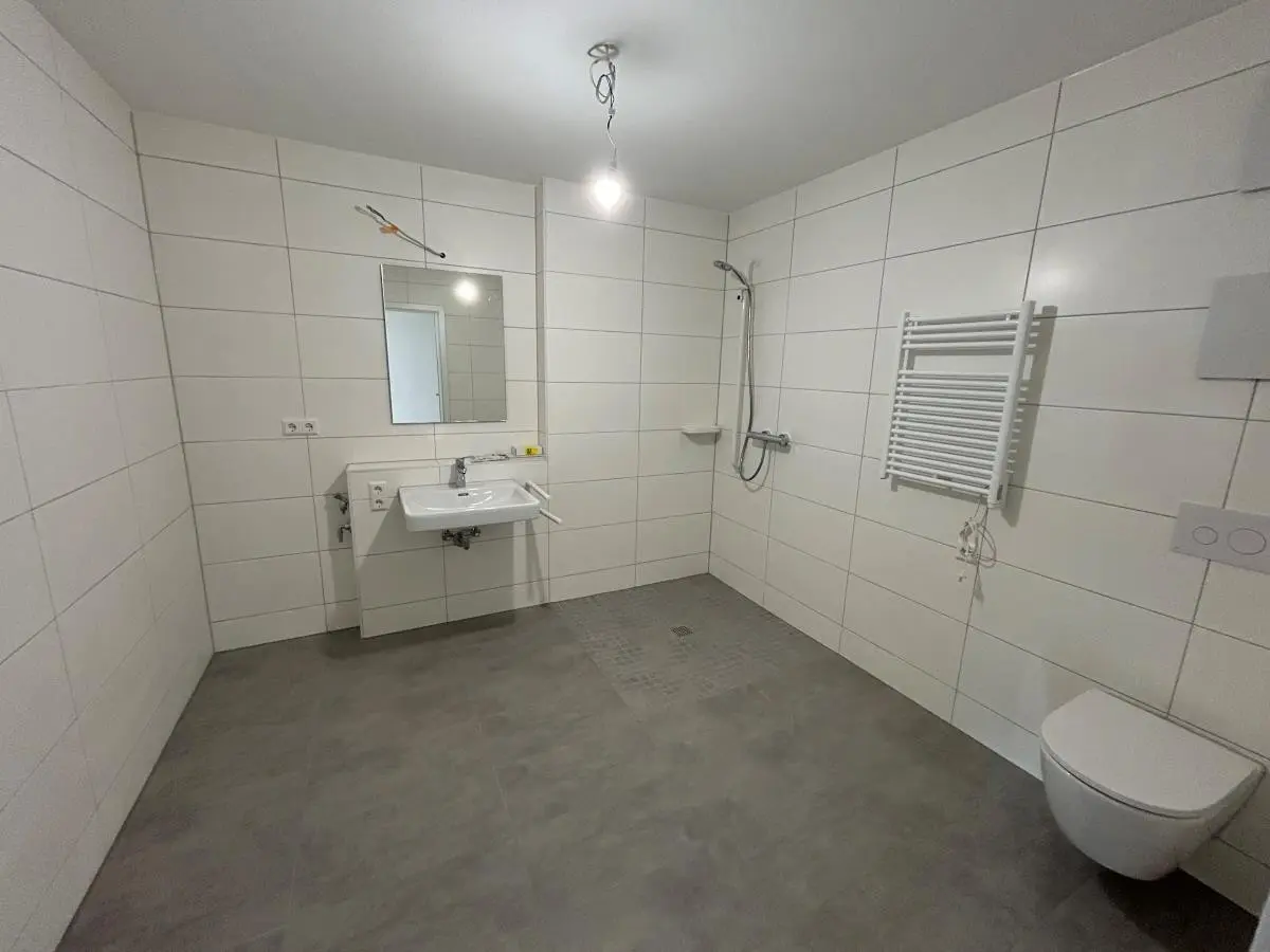Modernes und rollstuhlgerechtes Badezimmer mit schicken hellgrauen Fliesen sowie bodengleich gefliester Dusche und zusätzlichem Handtuchheizkörper.
