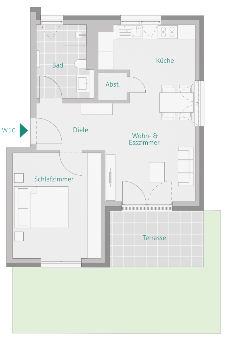 Das Wohn-/Esszimmer ist offen und hell und bietet Platz für die große Einbauküche (bereits im Preis enthalten)* – auf Wunsch kann diese auch räumlich abgetrennt werden. Direkt an die Küche angrenzend finden Sie eine praktische Speise- & Abstellkammer. Der Esstisch findet direkt vor den großen Fenstern Platz, vom Wohnzimmer aus gelangen Sie auf Ihre sonnige Südterrasse und in den eigenen Garten mit ca. 23 m²).