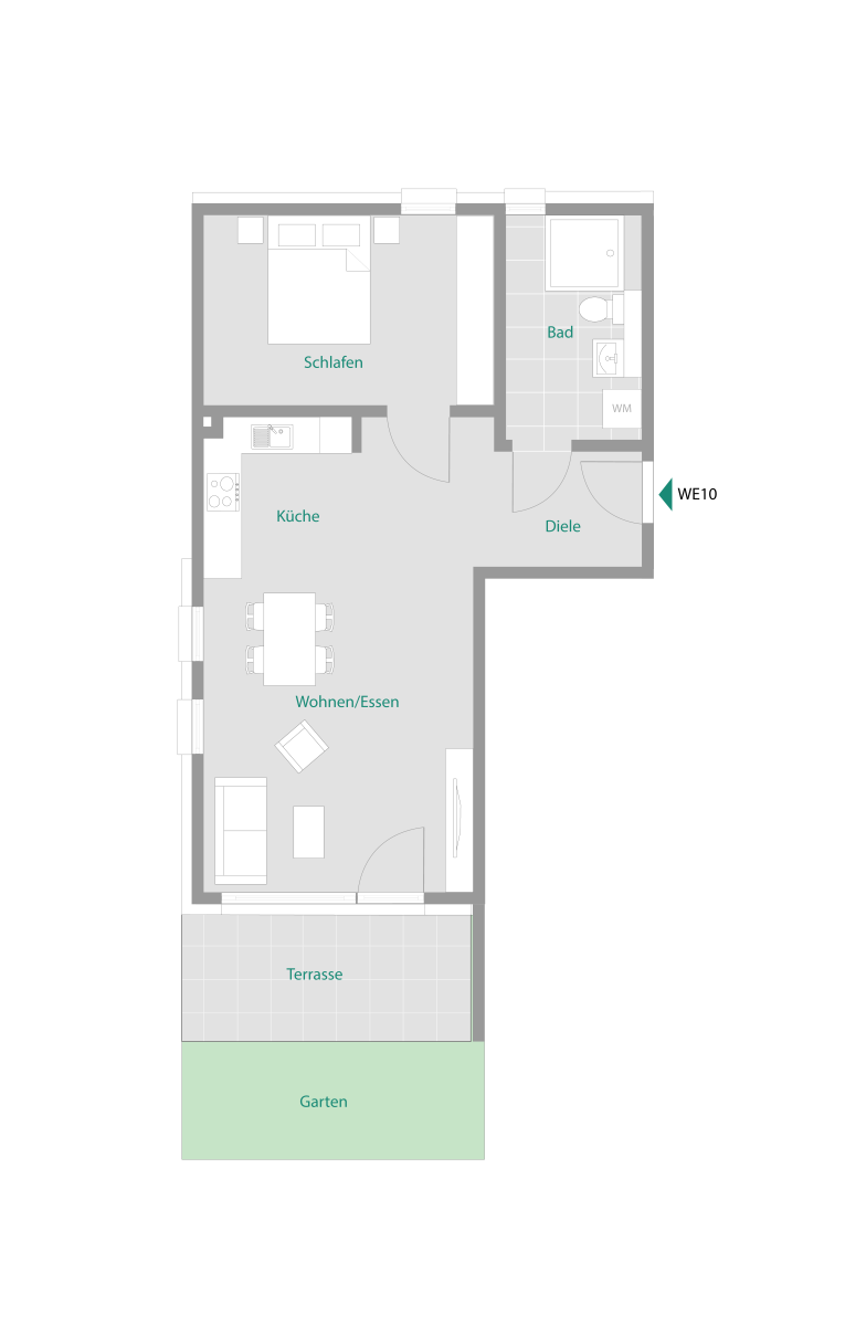 Die Küche ist funktional angeordnet und erlaubt kurze Wege im Alltag. Vom Wohnzimmer aus gelangt man direkt auf die West-Terrasse, die ebenerdig angelegt ist und einen bequemen Übergang ins Freie ermöglicht. Der angrenzende Garten bietet Raum für Erholung, entspannte Stunden an der frischen Luft oder Möglichkeiten zum Anpflanzen.