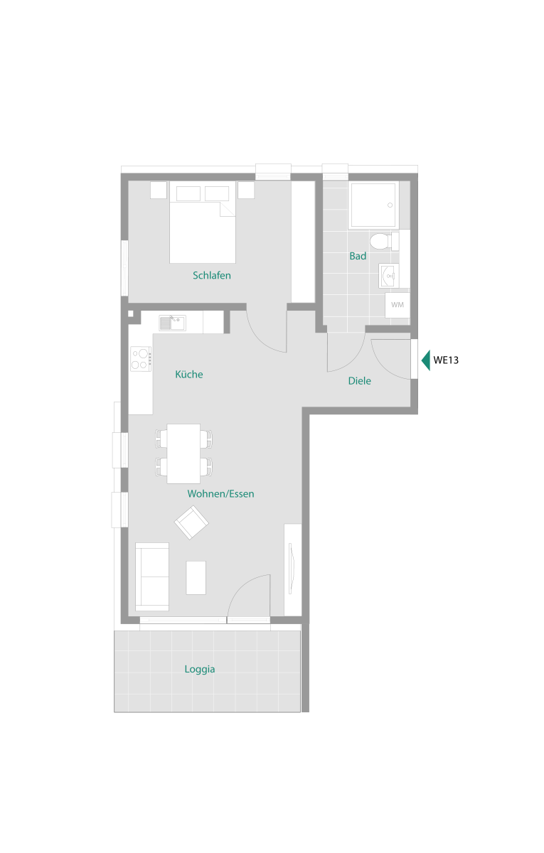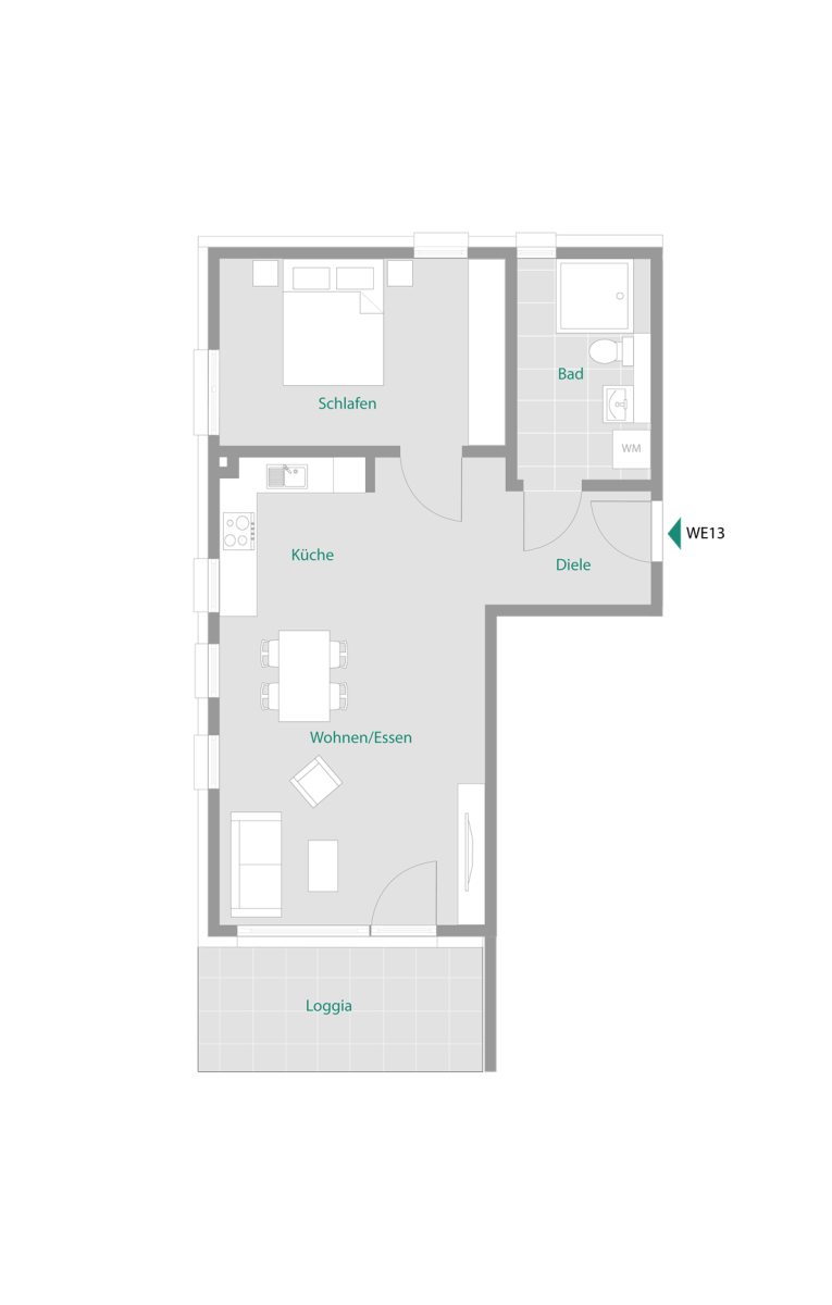 Der offene Wohnbereich bildet das Herzstück der Wohnung und bietet ausreichend Platz für Wohnen und Essen. Große Fenster sorgen für viel Tageslicht und schaffen eine freundliche Atmosphäre. Von hier aus besteht ein direkter Zugang auf den Balkon in westlicher Ausrichtung.