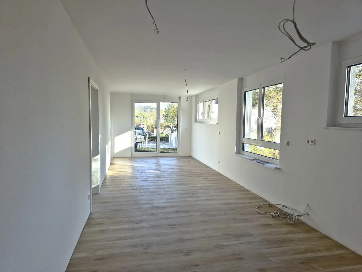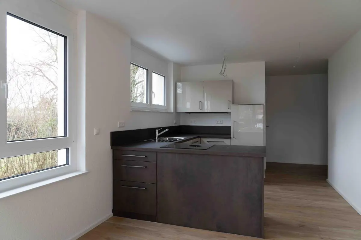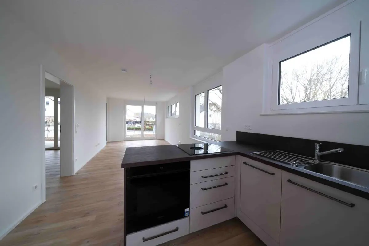 Treten Sie ein in den geräumigen Eingangsbereich, der über einen praktischen Abstellraum direkt in der Wohnung verfügt. Der moderne und offene Wohn- und Essbereich ist hell und freundlich gestaltet, dank zahlreicher Fenster. Die nagelneue Einbauküche in schicker grauer Optik (U-Form) lädt zum Kochen und Verweilen ein.