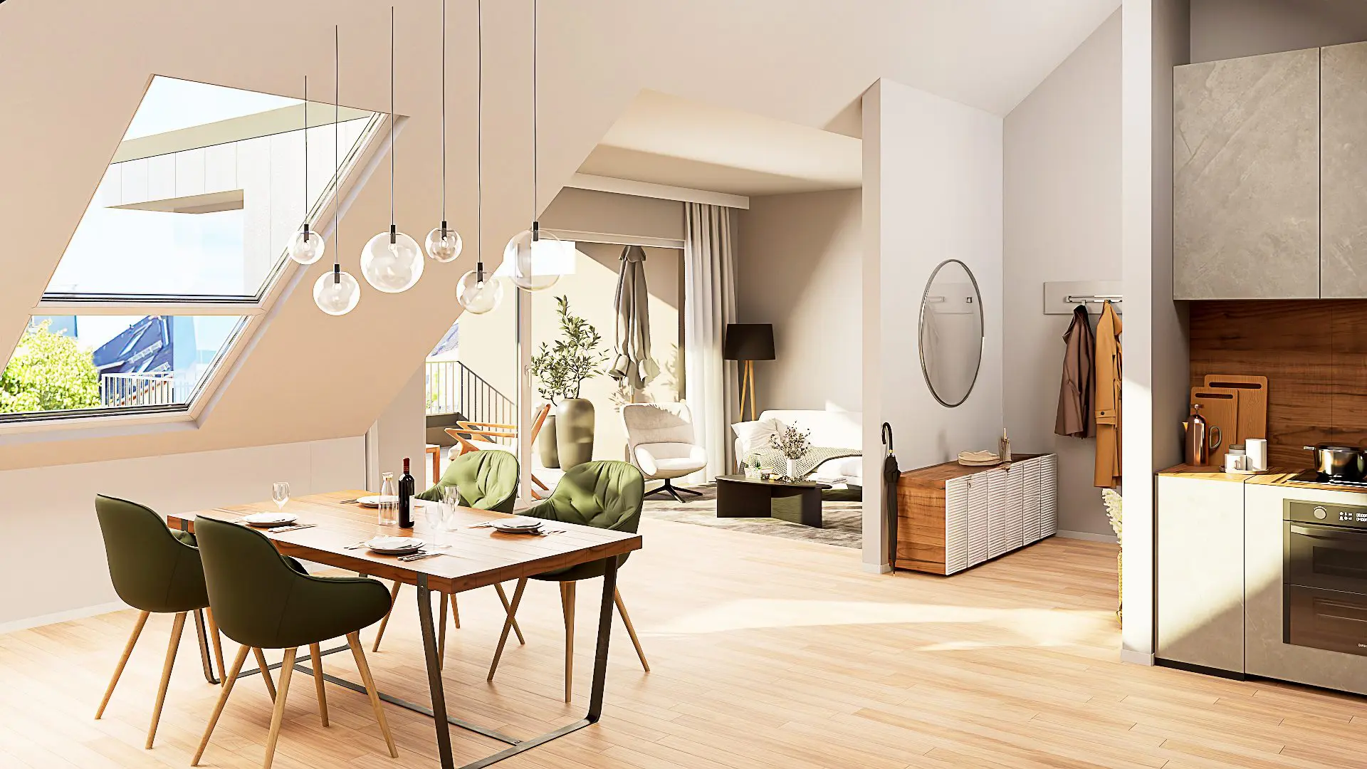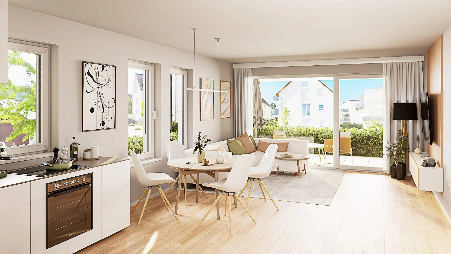 Ein großzügiger Gemeinschaftsraum lädt zu geselligen Stunden und gemeinsamen Aktivitäten ein, während gleichzeitig jeder seine Privatsphäre in den eigenen vier Wänden genießen kann.